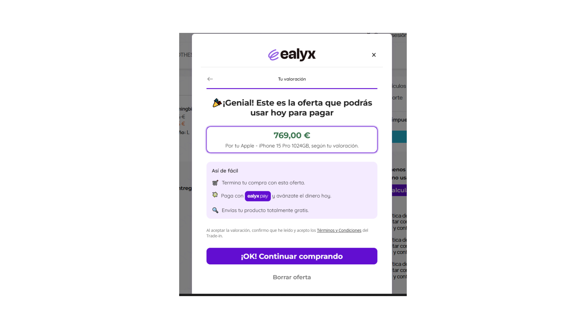 Once product attributes and condition are defined a Trade-in offer is shown to the consumer (this offer may vary depending on multiple variables). Here is an example of this step:
