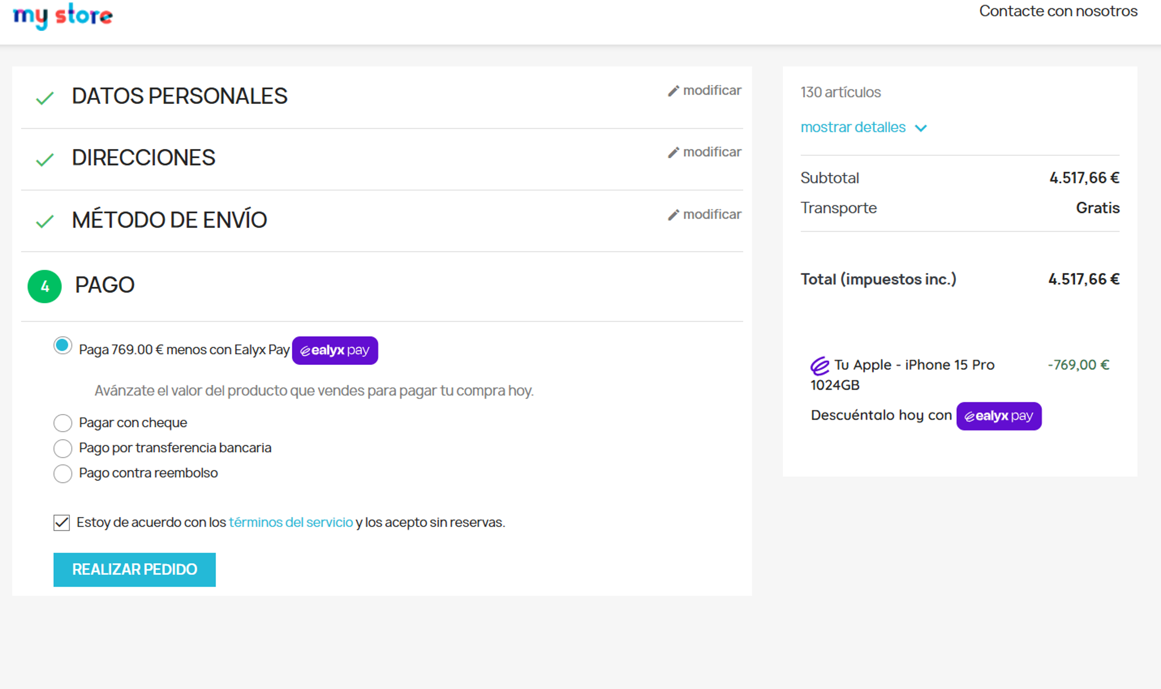 Make sure that Ealyx Pay is present at checkout also as a payment method and is displayed next to the other payment methods.
