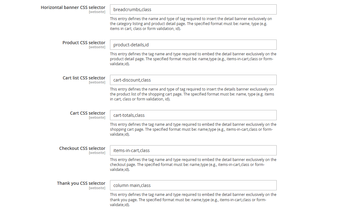 | Product CSS Selector | Selector for embedding banner on product detail page |