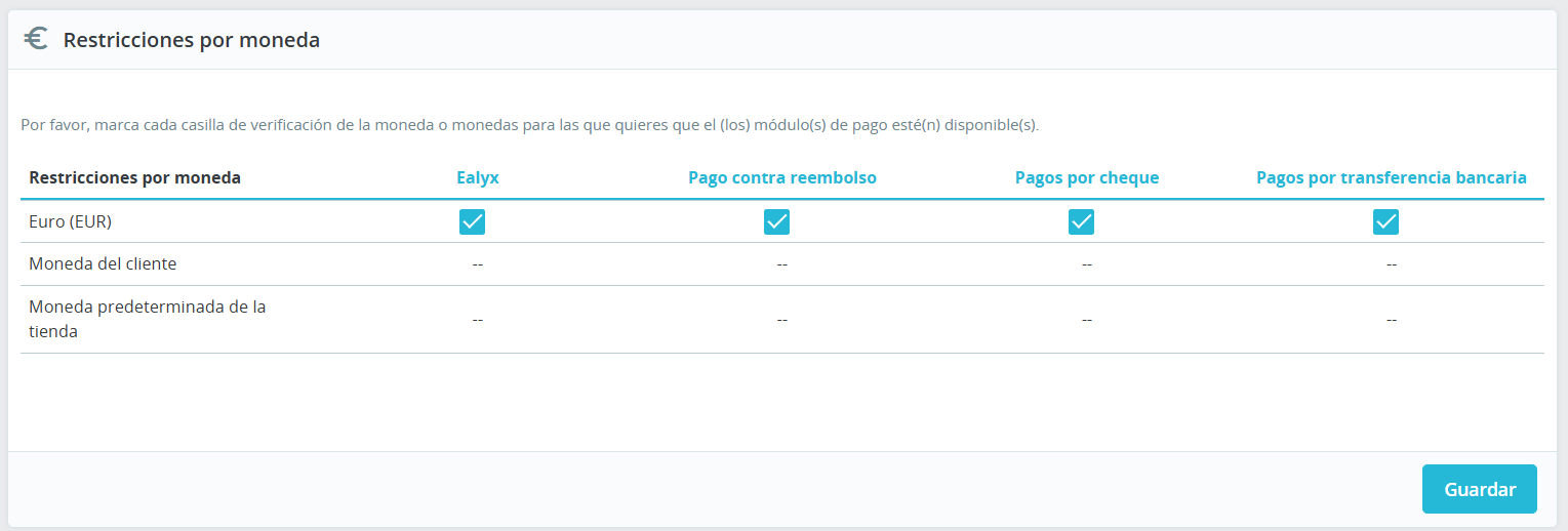 Select the currencies in which your customers will be able to pay with Ealyx Pay.
