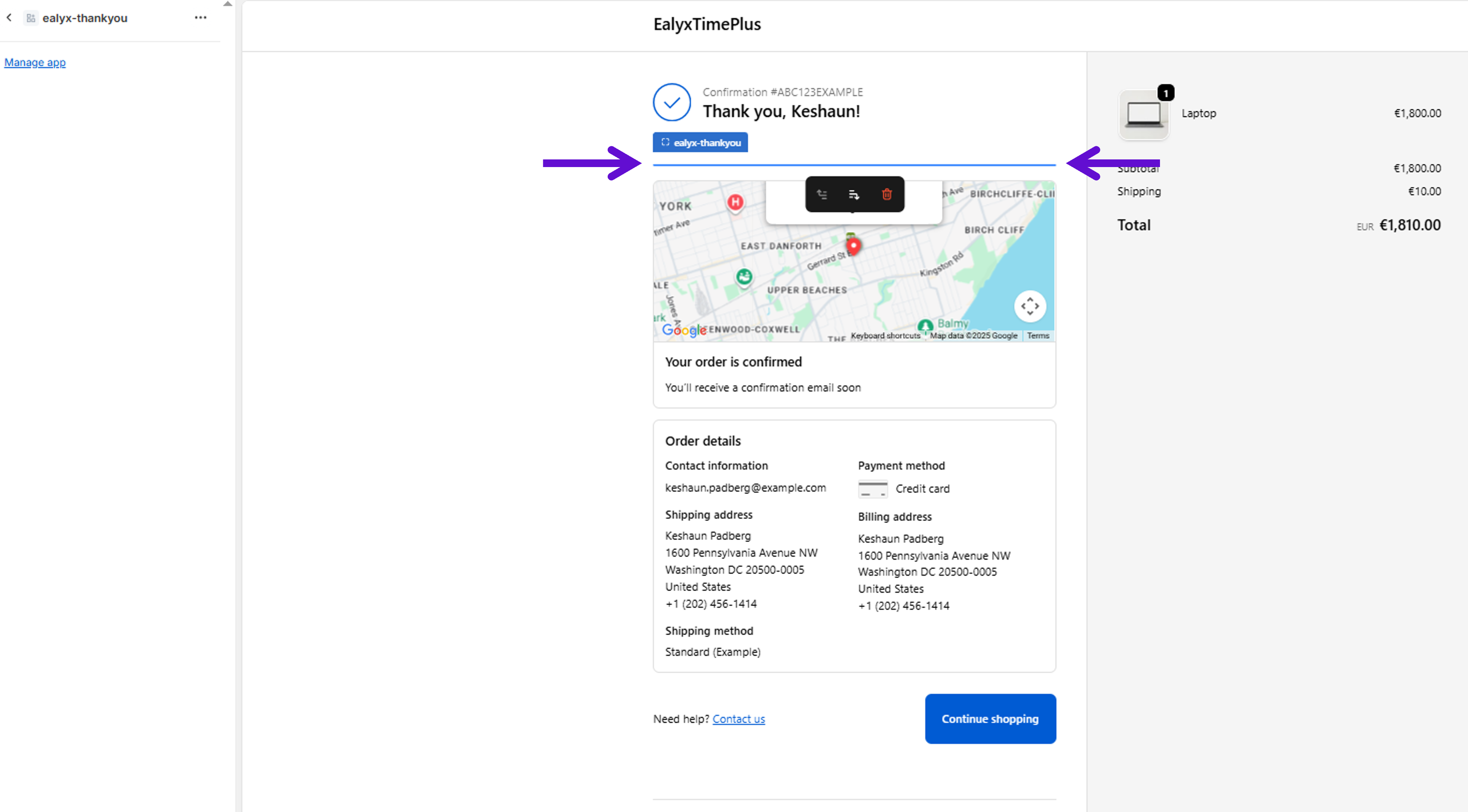Ealyx includes two additional widgets that appear during the final stages of the purchase flow: